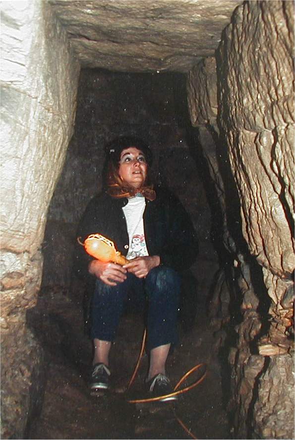 In the tunnel near the chamber. Person is seated on back ledge of the chamber
