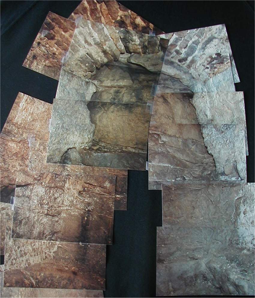 Composite of photos of the back wall of the chamber. Note the arched ceiling laid up with narrow stones with mortar in between them.