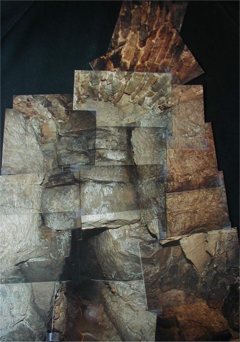 Composite of photos of the front wall of the chamber. The end of the tunnel is at the bottom of the picture.